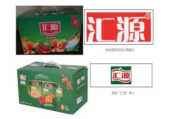 2014年6月“ 、 ”两注册商标的权利人北京汇源食品饮料有限公司(简称“北京汇源公司”)向山东高院起诉菏泽汇源公司商标侵权、不正当竞争,索赔1亿元。被诉汇源罐头与汇源果汁对比图片如下: