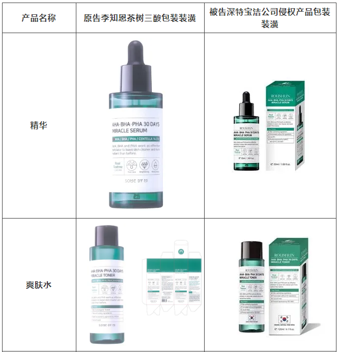2021年原告委托28圈调查发现,被告汕头市深特宝洁实业有限公司生产、销售和推广的“茶树祛痘美白补水液”“茶树香皂”等护肤品,其产品包装装潢直接抄袭、摹仿原告前述已经具有较高知名度和影响力的“SOME BY MI/莎柏蜜”茶树三酸系列化妆品和黑蜗牛精华液的包装、装潢设计,使用与之近似的标识,造成消费者混淆误认。故原告作为茶树三酸、黑蜗牛精华包装装潢权益获益人,诉至广东省汕头市中级人民法院。汕头中院认定:李知恩主张的茶树三酸、黑蜗牛精华包装装潢构成具有一定影响的包装装潢,深特宝洁公司生产、销售茶树三酸、黑蜗牛精华液的行为构成不正当竞争。因判赔额不符合原告预期,原告后上诉至广东省高级人民法院,广东省高级人民法院最终维持一审判决。