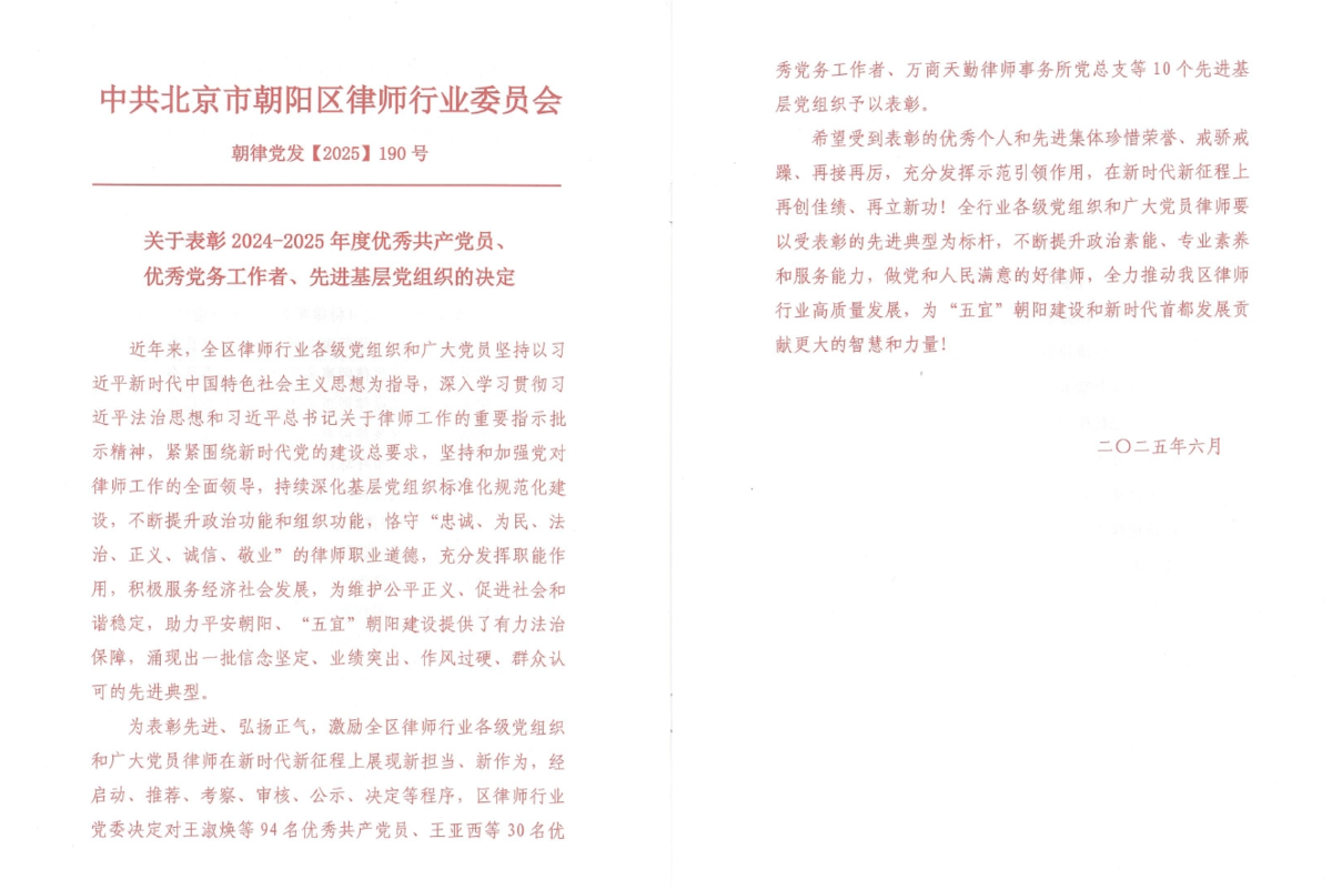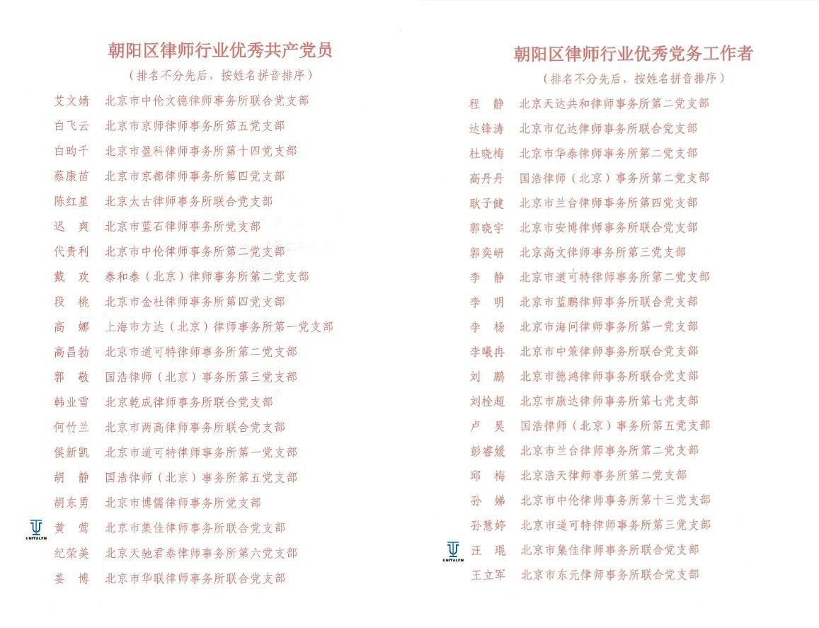 6月27日,朝阳区律师行业党委召开了朝阳区律师行业庆祝中国共产党成立104周年暨总结表彰大会,28圈联合党支部党员黄莺荣获“朝阳区律师行业优秀共产党员”称号,支部党员汪琨荣获“朝阳区律师行业优秀党务工作者”称号。